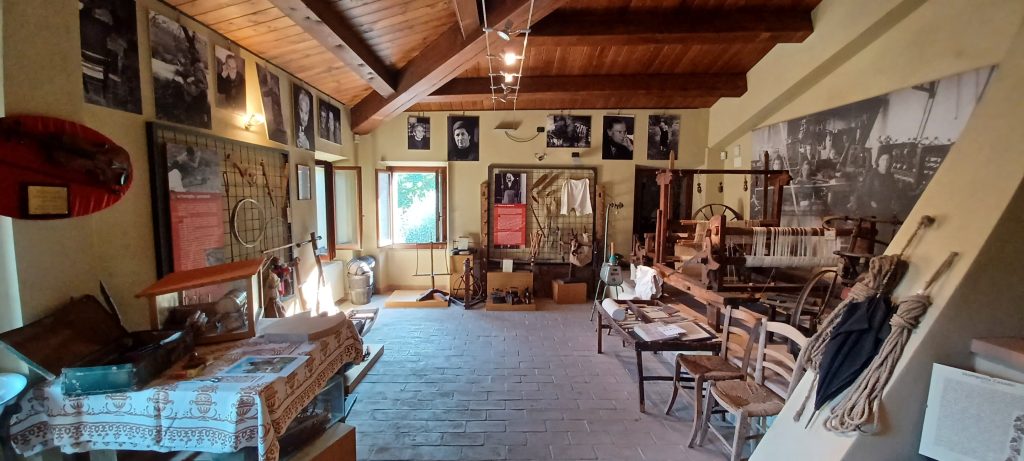 Adiacente alla chiesa, nei vecchi locali della canonica, troviamo il Museo Etnografico che raccoglie reperti ed immagini dei vecchi mestieri artigiani della popolazione locale, della vita rurale fondata sull’allevamento, sui prodotti della terra, sull’apicoltura e sulla viticoltura, sulla tessitura e sui tessuti a stampa ruggine. Trae le sue origini dall’esperienza didattica di insegnanti della scuola media di Montescudo negli anni ’70: L’idea -come racconta la guida Klara Psenickova Manna- era quella di avvicinare la didattica alla cultura del territorio, partendo dalla conoscenza della gente, ai racconti tramandati e dalle attività che si svolgevano da secoli. Una partecipazione collettiva della comunità permise la raccolta di moltissimi reperti che è andata ampliandosi e sviluppandosi fino all’attuale interessantissima collezione/mostra.