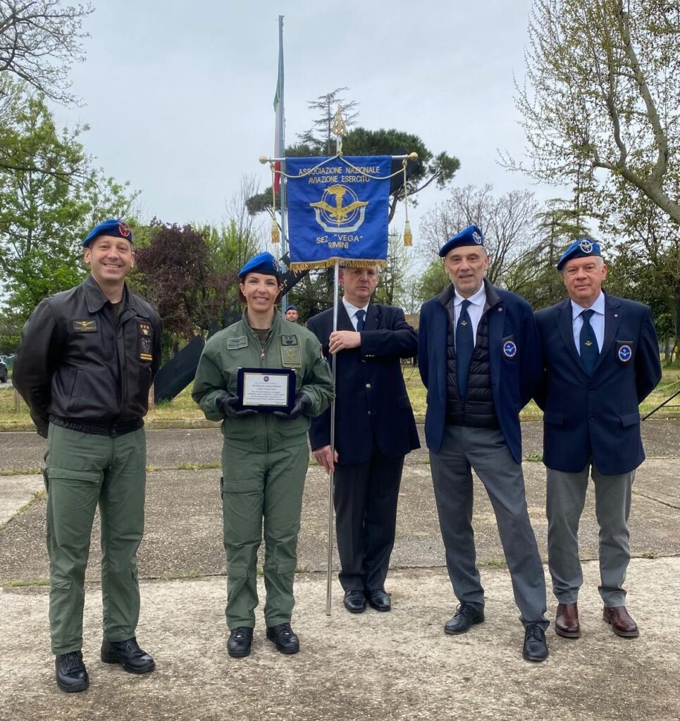 Al termine dell’evento, è stata l’occasione per il Col. Mauro Bloise, direttore editoriale del Basco Azzurro, per consegnare alla socia Ten.Col. Pamela Sabato, a nome del presidente nazionale ANAE Gen. Sergio Buono, una targa ricordo per la sua attività di comunicazione a favore dell’associazione come madrina di due edizioni della cerimonia di presentazione ufficiale del calendario ANAE, che l’ufficiale pilota riminese non aveva potuto ritirare direttamente durante l’evento “Presentazione Calendario ANAE 2025”.